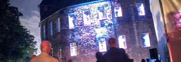 Dieses Jahr war es ein klein wenig anders. Neben all den Diskussionen um die unabänderliche Überwachungs-Situation, (früher, vor dem global village waren es die Nachbarn) gab es Überraschendes. Da war dieses – ich sage mal – nette Projekt „BYOB – Bring Your Own Beamer“. Beim Start noch im Cafe Spitzboden in der Lagerhalle untergebracht, zog es die Aktiven angesichts des wohlig-molligen Klimas alsbald hinaus an die Luft. Schnell war die Kunsthalle Dominikanerkirche als Projektionsfläche ausgemacht. Wie schön. Dass dann aus umliegenden Häusern die Nachbarschaft aus ihren in 3. Etage gelegenen Wohnungen mitmachte, brachte einen zusätzlichen Reiz: Höhere Projektionen hat man in Osnabrück wohl kaum gesehen. (Foto: Fassadenprojektion Schloss Moers)